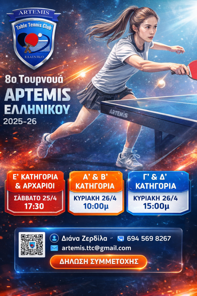 Για να δείτε πληροφορίες σχετικά με τον σύλλογο, πατήστε εδώ Α.Σ. ΑΡΤΕΜΙΣ ΕΛΛΗΝΙΚΟΥ Α.Σ. ΑΡΤΕΜΙΣ ΕΛΛΗΝΙΚΟΥ Πιγκ Πονγκ Έλα κι εσύ και ξεκίνα σήμερα το …