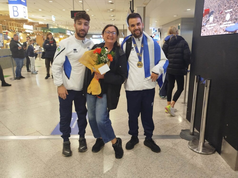 Την αποστολή υποδέχτηκαν με θερμά χειροκροτήματα ο πρόεδρος της Ε.Α.ΟΜ. – Α.Με.Α. Κωνσταντίνος Σιάχος, η προπονήτρια Λιντία Ιγκνάτοβιτς, οι γονείς του Μουχθή, Αναστασία και Νικόλαος, η σύζυγός του Αναστασία, η μητέρα της Μπουρνιά, Κατερίνα και άλλοι συγγενείς και φίλοι των αθλητών.
