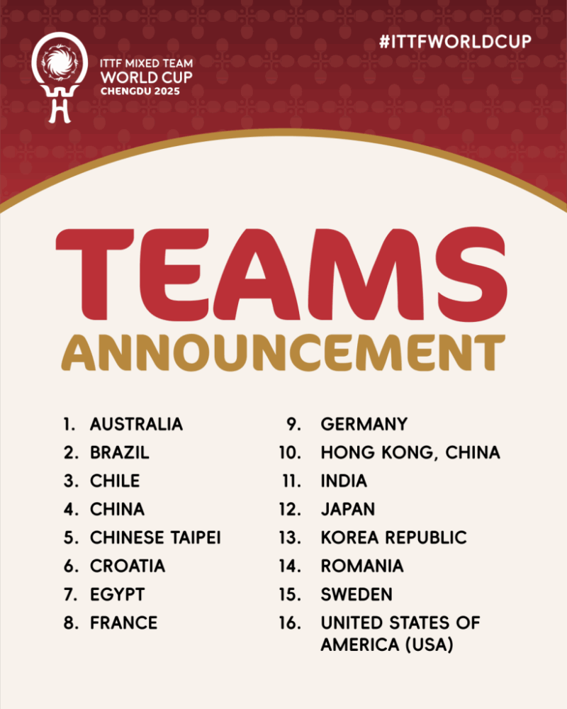 Η ITTF επιβεβαίωσε τις 16 ομάδες που θα αγωνιστούν στο Παγκόσμιο Κύπελλο Μικτών Ομάδων ITTF 2025, το οποίο θα διεξαχθεί στο Τσενγκντού της Κίνας, από τις 30 Νοεμβρίου έως τις 7 Δεκεμβρίου.