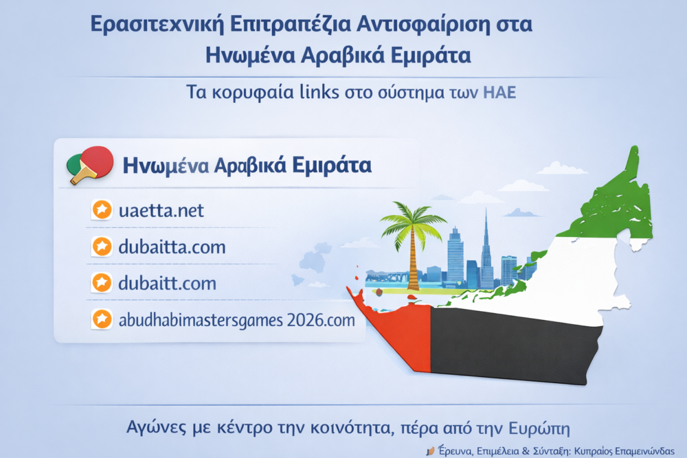 Σημαντικό ρόλο παίζουν και οι μεγαλύτερες διοργανώσεις, όπως το Abu Dhabi Sports Championship, όπου η επιτραπέζια αντισφαίριση εντάσσεται σε ένα ευρύτερο αθλητικό πλαίσιο, καθώς και το Open Masters Games Abu Dhabi 2026, που απευθύνεται σε μεγαλύτερες ηλικίες. Αυτό το στοιχείο είναι ιδιαίτερα σημαντικό, καθώς φέρνει το μοντέλο των ΗΑΕ πιο κοντά στη φιλοσοφία των veterans διοργανώσεων που συναντάμε στην Ελλάδα.
