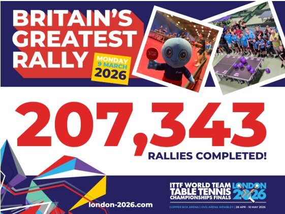 • Εκατοντάδες παίκτες επιτραπέζιας αντισφαίρισης σε όλη την Αγγλία έπαιξαν 207.343 ράλλυ σε μία ημέρα, περισσότερο από το διπλάσιο του στόχου, στο πλαίσιο του Britain’s Greatest Rally.