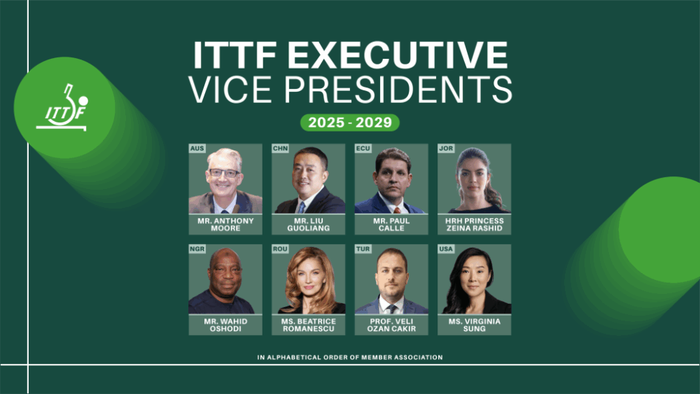 Με την ολοκλήρωση της σημερινής συνεδρίασης, η ιδιότητα μέλους της ITTF εξέλεξε το πλήρες Εκτελεστικό Συμβούλιο για την περίοδο 2025-2029. Τα παρακάτω οκτώ Εκτελεστικά Αντιπροέδρους θα υπηρετήσουν μαζί με την Πρόεδρο Petra Sörling (SWE), η οποία επανεξελέγη τον Μάιο κατά την αρχική σύνοδο της AGM: