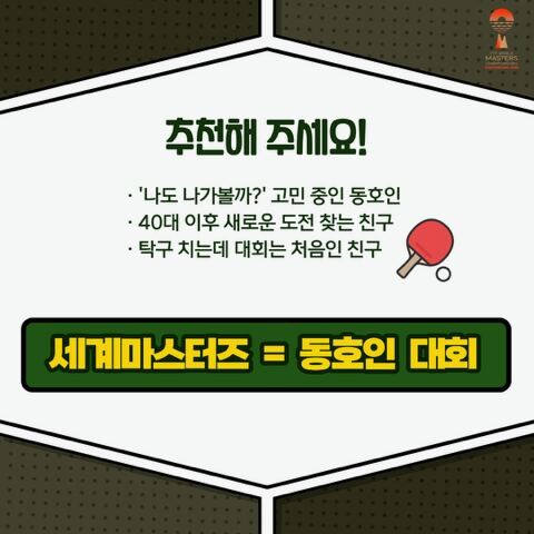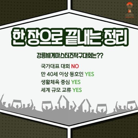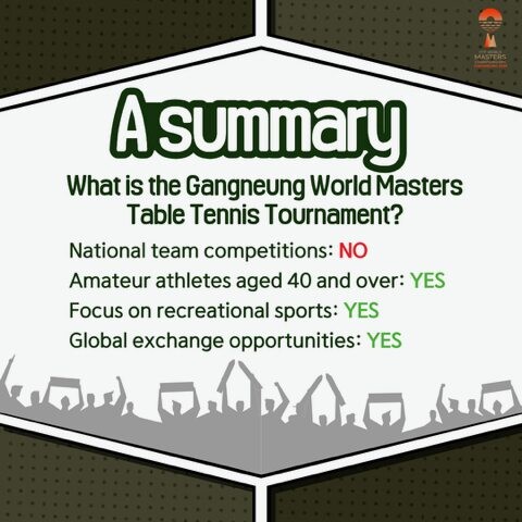 Το Παγκόσμιο Πρωτάθλημα Επιτραπέζιας Αντισφαίρισης Masters της ITTF – Gangneung 2026 αποτελεί μία από τις σημαντικότερες διεθνείς διοργανώσεις πινγκ πονγκ για αθλητές άνω των 40 ετών από όλο τον κόσμο. Πρόκειται για ένα πραγματικά παγκόσμιο γεγονός, ανοιχτό όχι μόνο σε επαγγελματίες αλλά και σε ενεργούς αθλητές – μέλη συλλόγων, που πληρούν τα ηλικιακά κριτήρια.