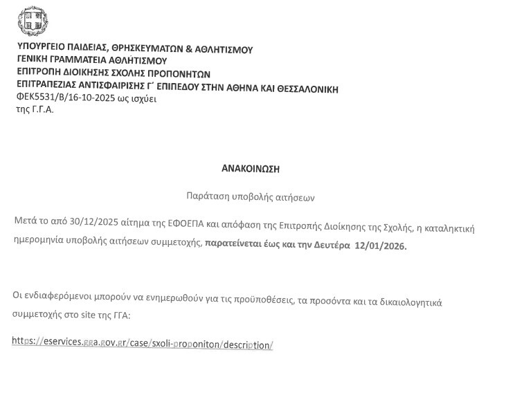 Παράταση υποβολής των αιτήσεων για τη Σχολή προπονητών Γ Επιπέδου Επιτραπέζιας Αντισφαίρισης