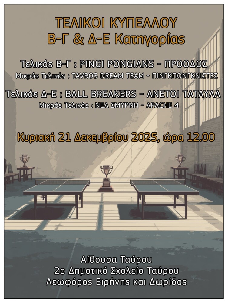 Οι τελικοί του Κυπέλλου κατηγοριών Β–Γ και Δ–Ε, καθώς και οι μικροί τελικοί για την τελική κατάταξη των ομάδων, θα πραγματοποιηθούν στην αίθουσα του Ταύρου στις 21 Δεκεμβρίου, με ώρα έναρξης 12:00.