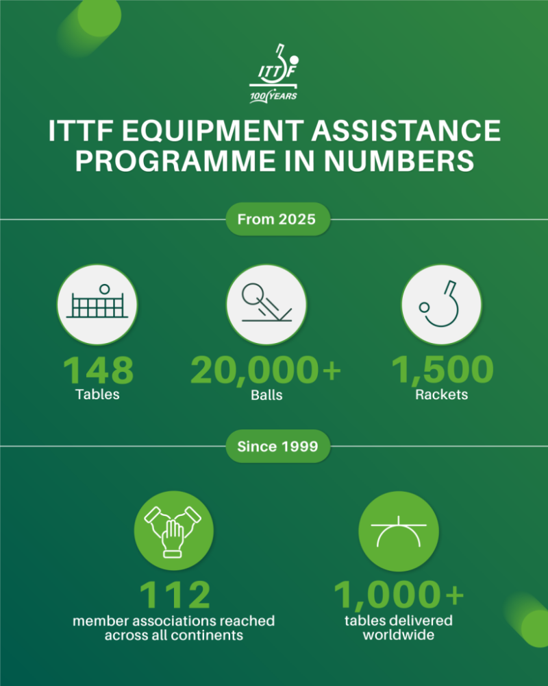 Το 2025, το πρόγραμμα υποστήριξε 18 ομοσπονδίες σε Αφρική, Αμερική, Ασία και Ωκεανία, ενώ επιπλέον αποστολές βρίσκονται ακόμη σε εξέλιξη. Η πρωτοβουλία διένειμε 148 τραπέζια, 130 surrounds, 1.500 ρακέτες και πάνω από 20.000 μπαλάκια, ενισχύοντας την ανάπτυξη βάσης (grassroots), τα σχολικά προγράμματα και τις δραστηριότητες εθνικών ομάδων.