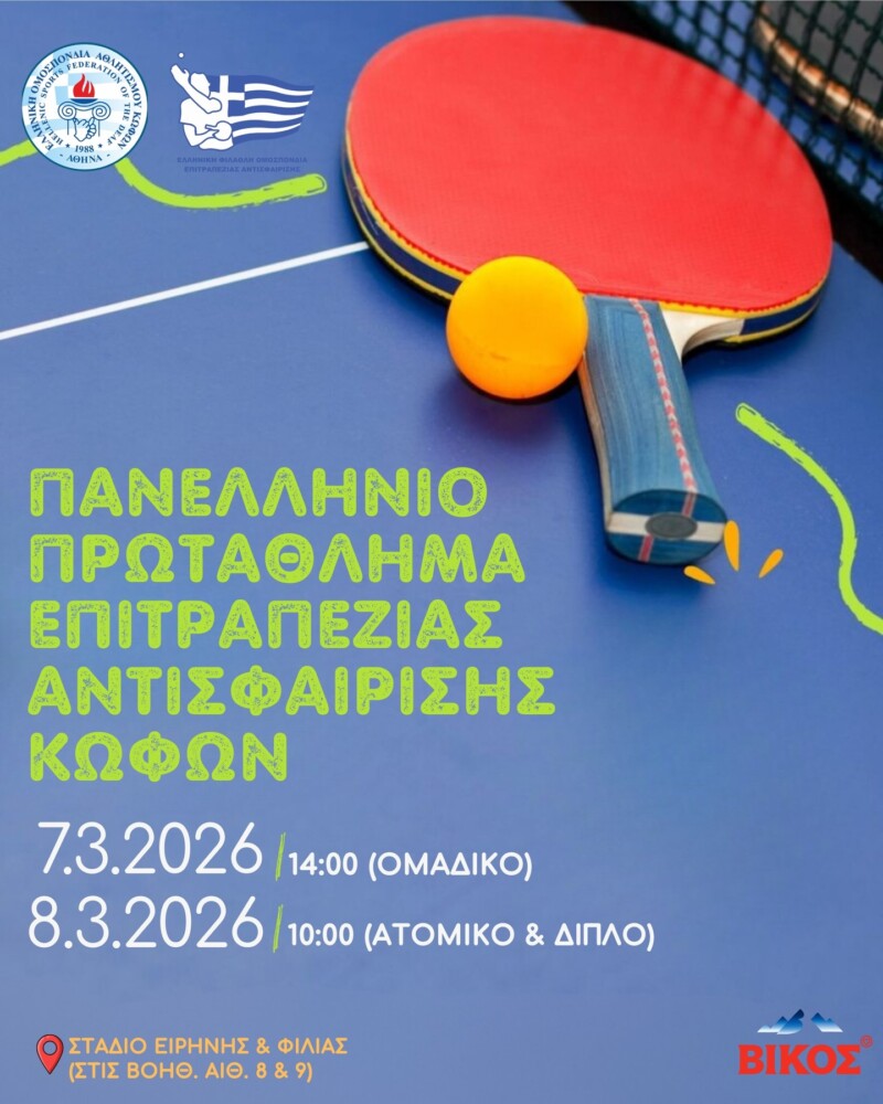 Η Ελληνική Ομοσπονδία Αθλητισμού Κωφών (Ε.Ο.Α.Κ.) προκηρύσσει το Πανελλήνιο Πρωτάθλημα Επιτραπέζιας Αντισφαίρισης Κωφών, της αγωνιστικής περιόδου 2025-2026, του οποίου η διεξαγωγή θα διεξαχθεί τo Σάββατο 7 Μαρτίου 2026 ώρα έναρξης 14:00 με το ομαδικό και την Κυριακή 8 Μαρτίου 2026 ώρα έναρξης 10:00 με το ατομικό και διπλό αγώνισμα.