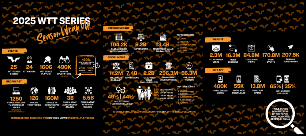 Σε 25 διοργανώσεις της Σειράς WTT σε 24 πόλεις-οικοδεσπότες, η σεζόν 2025 κατέγραψε συνολική παγκόσμια τηλεοπτική απήχηση 5,5 δισεκατομμυρίων, με αθροιστικό κοινό 3 δισεκατομμυρίων, και ζωντανή κάλυψη σε 126 τηλεοπτικές αγορές παγκοσμίως. Στις αρένες, το WTT υποδέχθηκε σχεδόν 490.000 θεατές, αύξηση 60% σε ετήσια βάση με την πλειονότητα των φιλάθλων να είναι κάτω των 35 ετών.