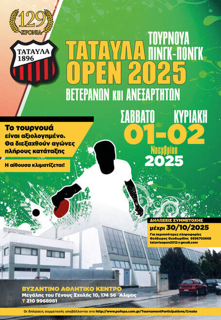 Οι αγώνες θα διεξαχθούν στην πλήρως κλιματιζόμενη ενιαία αίθουσα προπόνησης επιτραπέζιας αντισφαίρισης του Βυζαντινού Αθλητικού Κέντρου (Μεγάλης του Γένους Σχολής 10, 17456 Άλιμος), σε 20 αγωνιστικά τραπέζια και θα πραγματοποιηθούν αγώνες πλήρους κατάταξης σε κάθε ηλικιακή κατηγορία και στο κυρίως ταμπλό και στο ταμπλό της παρηγοριάς.